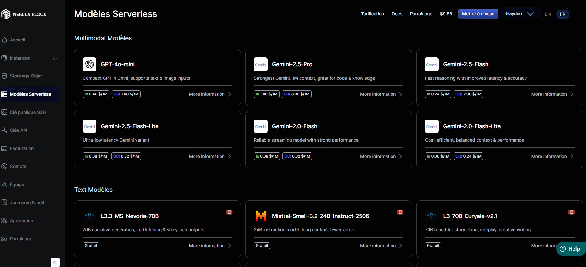 - Variété de modèles : de modèles de raisonnement comme DeepSeek à des systèmes multimodaux comme Gemini, Nebula Block offre un catalogue étendu pour divers scénarios éducatifs.