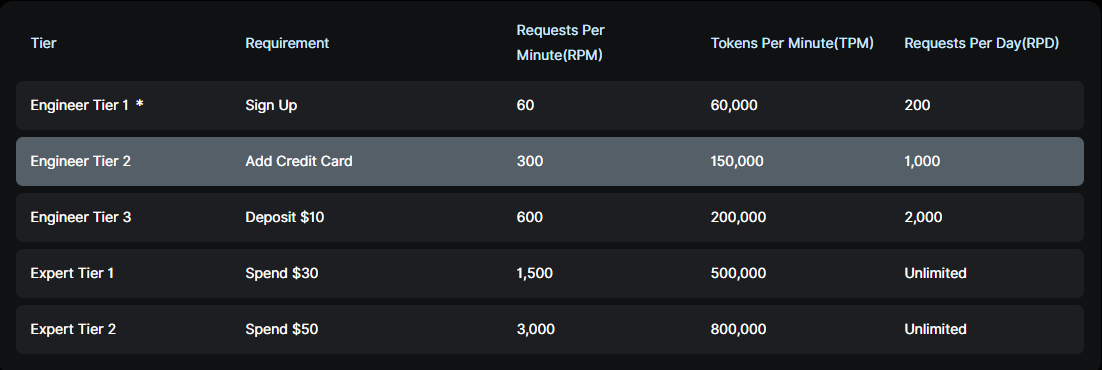 Important: To get free access to DeepSeek and other mini models, please upgrade to Engineer Tier 2 by adding your credit card (no charge) or deposit $10.