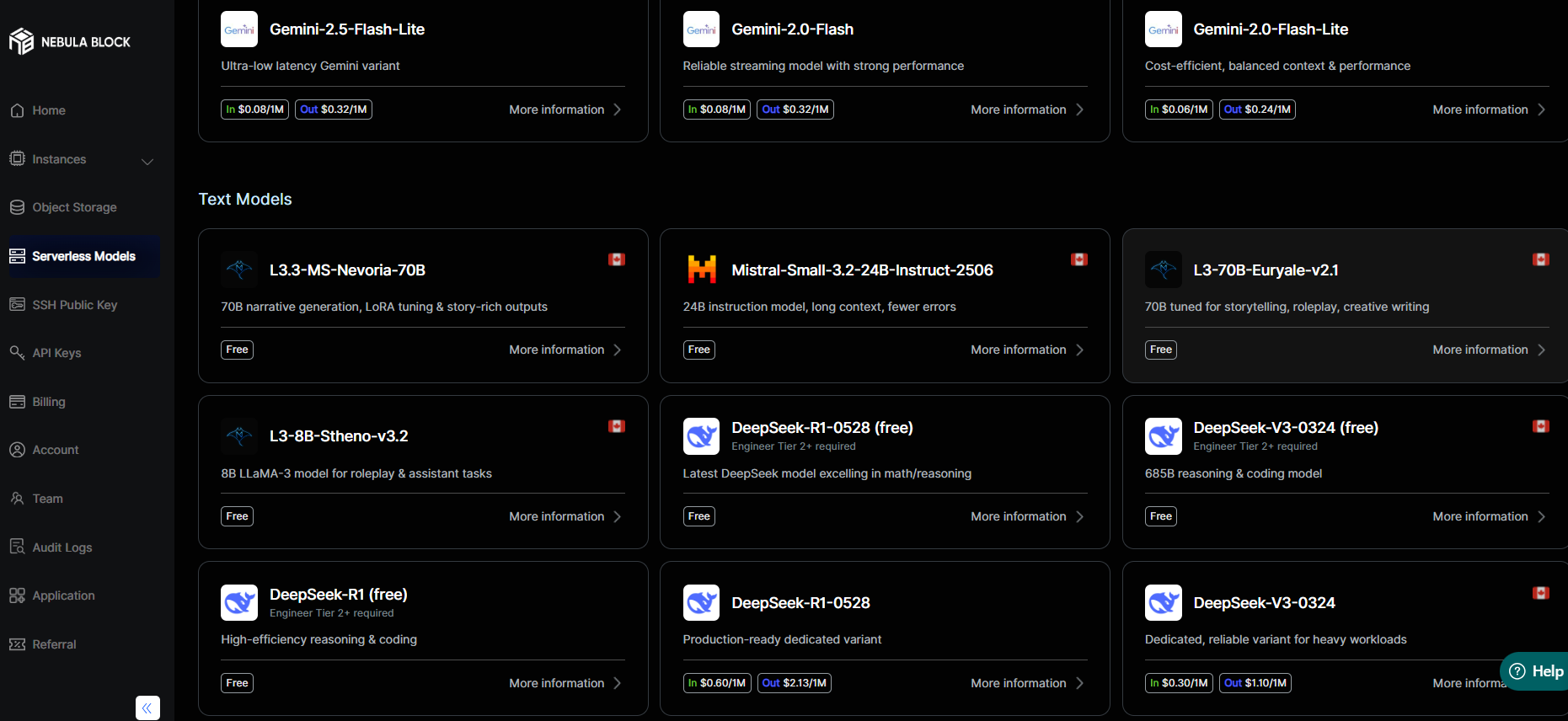 Nebula Block currently provides multiple models under its Free API tier, and the most popular for Chub AI users is: